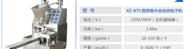 XZ-87S型雙餡斗全自動(dòng)包子機(jī),可生產(chǎn)各種肉包、肉菜包、菜包、小籠包、湯包、水晶包、圓饅頭、奶黃包、豆沙包、叉燒包、南瓜餅等幾十種包餡制品。適用于賓館、飯店、學(xué)校、機(jī)關(guān)企業(yè)食堂、饅頭或包子加工廠、早餐工程店及速凍食品廠等單位??蓾M足不同客戶群體。免費(fèi)提供工藝技術(shù)。免費(fèi)上門培訓(xùn)指導(dǎo)安裝。