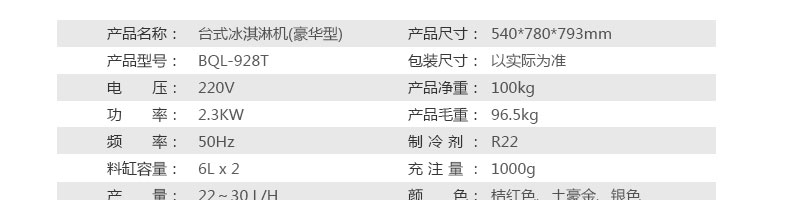 BQL-928T臺式冰淇淋機,1.選用國際牌壓縮機,輔以旭眾精湛工藝,大大縮短冰淇淋成型時間,高效節(jié)能;2.全新液晶智能觸控面板,簡單明了,多功能易操作;3.全新升級專業(yè)膨化泵,膨化率高,產(chǎn)量增加30%;4.一鍵清洗功能,省時方便;5.主要部件采用不銹鋼材質(zhì),時尚美觀,持久耐用;6.先進的機械攪拌系統(tǒng),機器運行穩(wěn)定可靠,低噪音,產(chǎn)品口感爽滑細嫩。