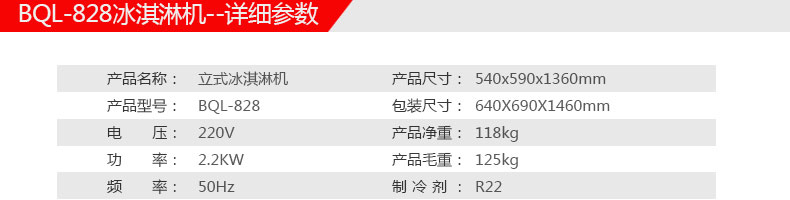 名稱BQL-828立式冰淇淋機 電源220V 功率2.2kw 產(chǎn)量18-28L/h 尺寸540*590*1360mm 重量118kg 規(guī)格 其他