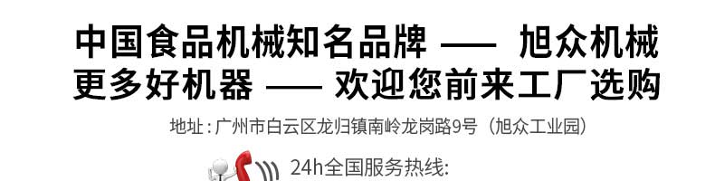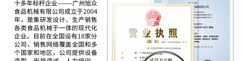 廣州旭眾食品機(jī)械有限公司是一家集科研開(kāi)發(fā),生產(chǎn)設(shè)計(jì),營(yíng)銷(xiāo)服務(wù)為一體的現(xiàn)代化生產(chǎn)企業(yè)?,F(xiàn)代化生產(chǎn)車(chē)間,精湛制造技術(shù),所產(chǎn)機(jī)械歷經(jīng)市場(chǎng)重重考驗(yàn),不斷贏得海內(nèi)外客戶的贊譽(yù)。
