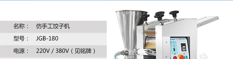 JGB-180餃子機(jī),先進(jìn)的自動(dòng)餃子生產(chǎn)設(shè)備,包括主動(dòng)壓皮部分、自動(dòng)供餡部分、自動(dòng)包合部分、自動(dòng)成品輸送部分,并且只要更換模具,就可制鍋貼等食品。適合食品速凍廠、飯店、廠礦學(xué)校食堂等制作包餡面制品單位使用。