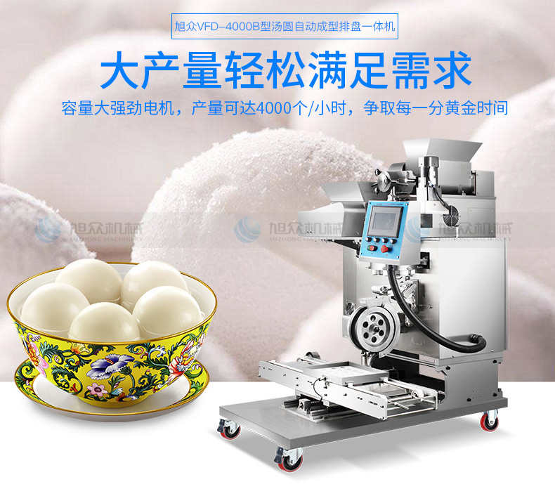 VFD-4000B湯丸機(jī),告別手工時(shí)代旭僉多功能湯圓機(jī)輕松解決問(wèn)題。大產(chǎn)量輕松滿(mǎn)足需求容量大強(qiáng)勁電機(jī),產(chǎn)量可達(dá)4000個(gè)小時(shí),爭(zhēng)取每一分黃金時(shí)間