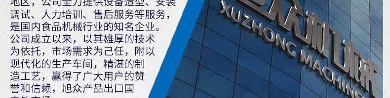 廣州旭眾食品機械有限公司是一家集科研開發(fā),生產(chǎn)設(shè)計,營銷服務(wù)為一體的現(xiàn)代化生產(chǎn)企業(yè)?,F(xiàn)代化生產(chǎn)車間,精湛制造技術(shù),所產(chǎn)機械歷經(jīng)市場重重考驗,不斷贏得海內(nèi)外客戶的贊譽。