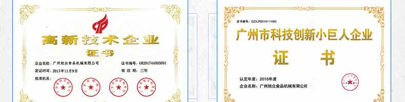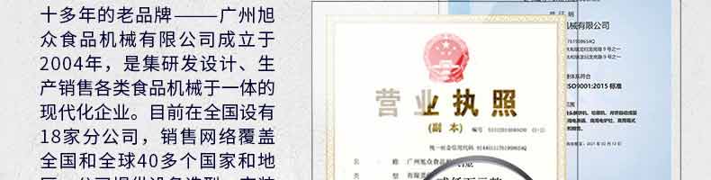 廣州旭眾食品機(jī)械有限公司是一家集科研開發(fā),生產(chǎn)設(shè)計,營銷服務(wù)為一體的現(xiàn)代化生產(chǎn)企業(yè)?,F(xiàn)代化生產(chǎn)車間,精湛制造技術(shù),所產(chǎn)機(jī)械歷經(jīng)市場重重考驗,不斷贏得海內(nèi)外客戶的贊譽(yù)。